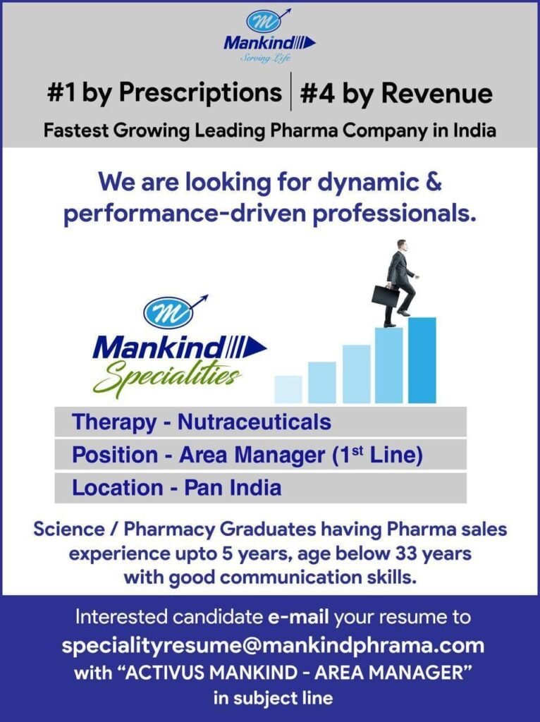 Interested candidate e-mail your resume to specialtyresume@mankindpharma.com with “ACTIVUS MANKIND – AREA MANAGER” in subject line