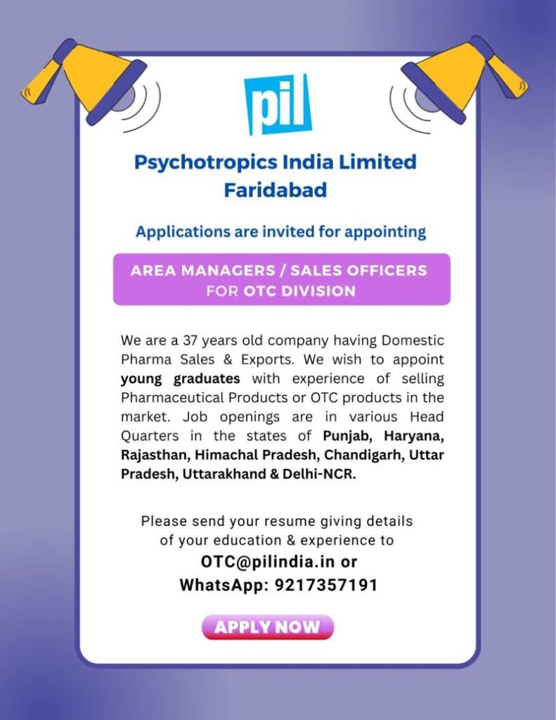 ASM/ Sales Officer Jobs in Delhi/NCR – Punjab – Haryana – Rajasthan – Himanchal Pradesh – Chandigarh – UP/UK in Psychotropic India LtdFebruary 27, 2026