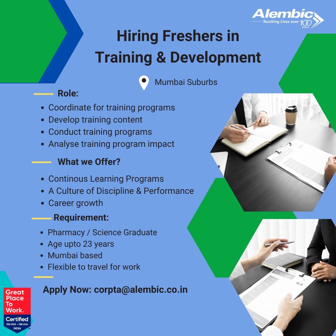Hiring Freshers in Training & Development Team- Alembic Pharma